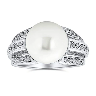 Bling Jewelry Bridal Pave CZ Solitaire White Simulated Pearl Fashion Statement Ring for Women Prom Silver Plated Brass