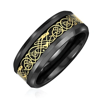 STUNNING DESIGN - This majestic men's wedding band ring will leave your beloved awestruck. Featuring a mesmerizing design with a Celtic dragon motif inlaid in gold plating, crafted with lustrous . Measure: 8MM Band Width Weight: 13.7 Gram Material: Titanium, Carbide Carbon Fiber Why not engrave names inspirational word letters, numbers, date, or coordinates. Unisex -durable will resist tarnish and never lose its shine Carbide metal is heavy and durable hypoallergenic and scratch resistant. Thoughtful Gifts for Him: Our jewelry is the perfect choice for special occasions such as Father's Day, birthdays, Christmas, holidays, graduations, groomsmen gifts, anniversaries, and Valentine’s Day. Whether it's for your best friend, boyfriend, brother, dad, grandfather, son, husband, uncle, nephew, a teenage guy, or even to treat yourself, our unique pieces make for meaningful and stylish gifts for men. USA-Based Company with 30-Day After-Sale Service: We take pride in our craftsmanship and product quality. Rest assured, if you receive an item with manufacturing defects, we've got you covered. Click on 'Sold by' to contact our friendly customer service. Your satisfaction is our top priority, and we'll do everything we can to make it right.