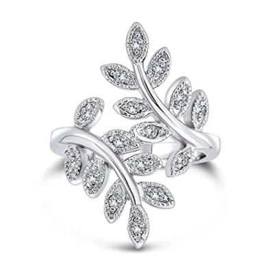 Bling Jewelry Nature Ivy Vine Leaf Fashion Statement Ring for Women Cubic Zirconia Pave CZ Bypass Silver Plated Brass