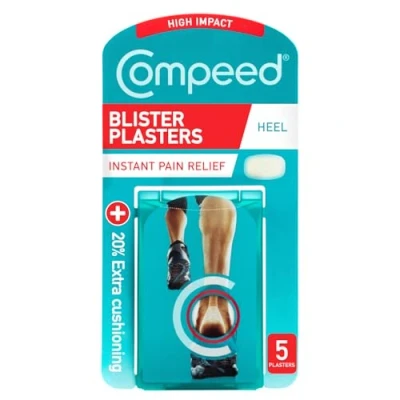 AmazonFaster Healing Blisters With Hydrocolloid Technology - Compeed Blister Plasters use Hydrocolloid Technology. This is where the plaster forms a second skin that keeps the blister moist and speeds up healing. Whilst preventing infection from bacteria Deep Cushioning Patches - Compeed Blister Plasters contain deep cushioning pads for blisters. This helps prevent painful rubbing, which is common with heel, foot and toe blisters that sit close to shoes or clothes and have been caused by rubbing Waterproof & Rub Proof Blister Plaster Design - Unlike regular plasters, tape or medical dressing, Compeed Blister Plasters use special adhesive and tapered edges to help stick tight in place without rubbing off. They are also breathable & Waterproof Pack Of 5 Extreme Individually Wrapped Blister Plasters - This pack contains 5 assorted plasters. Great for treating blisters on the heel, foot, or other areas. They are also individually wrapped making them great for use on the go 95% Of Users Agreed That Compeed Provides Instant Pain Relief* - Compeed Blister Plasters have also been clinically tested for effectiveness against Blisters. In a 2021 study, 95% of participants reported instant pain relief with Compeed Plasters *Compeed Clinical Study For MDR (2021)