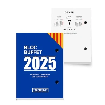 Striking Visual Design: Features a vibrant blue cover with white text that highlights the year 2025, capturing attention and making it easy to identify quickly. Multilingual and Cultural: Available in Spanish and Catalan versions, each pad includes days and months in multiple languages, reflecting cultural and linguistic diversity. Taxpayer Calendar Included: Each pad contains a taxpayer calendar, essential tool for tax planning, with key dates highlighted. Clear Weekly Organization: Days of the week are arranged so that each page offers a complete overview of the week, with additional space for important notes. Holiday and Cultural Data: Includes information about local festivities and relevant appointments on each date, adding additional value for the user looking for more than just a calendar.