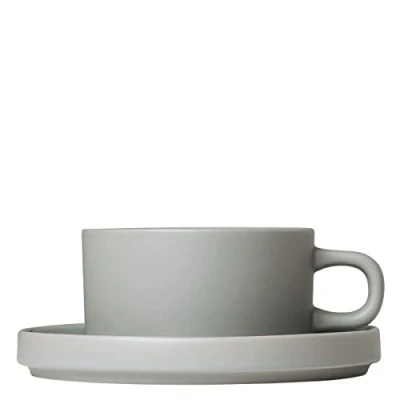 Dimensions: height 5 cm, depth 12 cm, diameter 9 cm, volume 170 ml, height 2 cm, diameter 14.5 cm Material: ceramic Available in 2 other colours Complete Pilar range available Simple elegance: the matte exterior surfaces are in harmonious contrast to the glossy interior glaze
