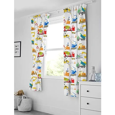 FUN, PLAYFUL DESIGN: This fun construction kids curtains set features all their favourite amazing machines: trucks, tractors, cranes and more. Perfect for those obsessed with all things diggers & cars!Add our matching kids duvet sets for a coordinating finish. PAIR OF LINED CURTAINS: All of our curtains are fully lined and crafted from a cotton-blend (52% polyester, 48% cotton) with tie backs included. They are a pencil pleat design which can also be fitted to a pole (eyelet) with curtain loops or hung onto a track. CHILDRENS BEDROOM CURTAINS: Bloomsbury Mill are award-winning manufacturers of childrens bedding and bedroom curtains. Every product meets the highest industry and quality standards so sleep soundly knowing you've chosen a product that is long lasting and made with love in each stitch for your child. CUTE DESIGNS: We have a range of designs so if you are looking for rainbow / pink curtains for girls bedroom or a space / dinosaur theme for boys bedroom then look no further! MEASUREMENTS: 66 x 72 Drop (168cm x 183cm). Size is per curtain panel and there are two panels with tie backs in a pack.