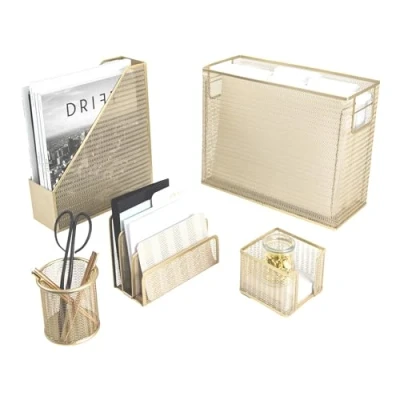 SET OF FIVE GOLD DESK ACCESSORIES: You can store all your supplies with this 5 piece set that includes a LETTER SIZE hanging file folder organizer, a magazine file holder, a pen cup, a sticky not holder, and a small file organizer - letter sorter. FUNCTIONAL: A hanging file folder holder, like most gold desk organizers and accessories will help keep you organized. A Gold file organizer for desk and other gold office supplies and accessories, can incorporate style, while maintaining function. FUN AND STYLISH: Whether you seek a standing file organizer with desk organizers and accessories gold, or a gold office organization and storage file basket with office supplies , this desk paper organizer gold delivers. Desk organizer gold for men VERSATILE AND CUTE: You can have functionality and fun; you don’t have to choose with gold office accessories for women, particularly gold desk accessories for women office with a file folder holder for desk. Gold office accessories for desk women LOTS OF STORAGE: Desk organizers gold need to hold everything, which is why office desk accessories for women set has it all. Hold your papers and supplies, with girly office supplies, cute office decor for women desk gold desk organizer and more.