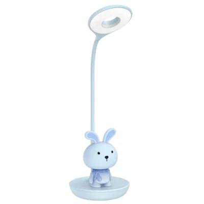 Blue Bunny model bedside reading and table lamp for childrens room 2.5W LED USB Rechargeable working time of 4 hours higher brightness and 8 hours lower brightness 5 modes touch control with function is controlled from the power button cool white reading light and warm white night light The lamp can be turned off after the 5 mode sequence by touching down the power button The lamp returns to its white colour light 6500k when turned off Mode 1 - Reading Light Lower Brightness - Mode 2 Reading Light Higher Brightness Mode 3 - Bunny Night Light Lower Brightness - Mode 4 Bunny Night Light Higher Brightness Mode 5 Reading and Bunny Night Light