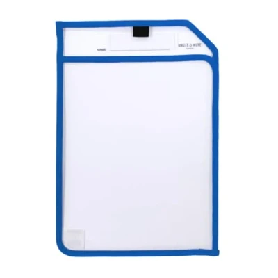 Blue Edge Clear Dry Erase Write and Wipe Reusable Sleeve Pocket These help save on paper in the classroom or workplace. Great teaching supplies and classroom resources. Take notes and memos using a dry wipe marker. Easily remove and reuse when finished. Keeps documents safe and secure Size: 255 x 375mm. Ideal for A4 Paper. 300 Micro Thickness.