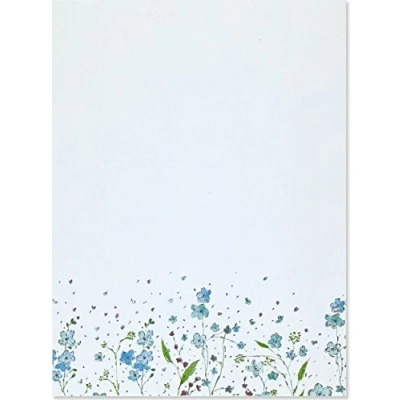 Stationery set contains 30 premium letter sheets and 24 matching envelopes. Light blue letter sheets depict an array of delicate watercolor blossoms. Design is embellished with flecks of silver foil. Premium paper takes pen beautifully. Stationery sheets are suitable for a variety of occasions.