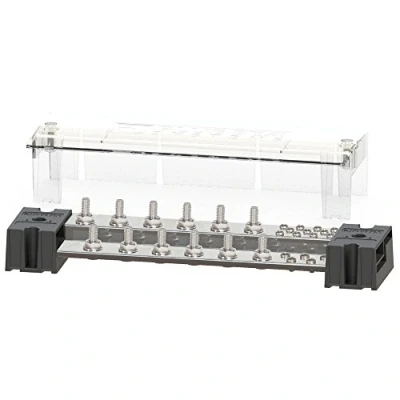 1000A PowerBar with twelve 5/16" terminal studs. 2 mounting holes accept #10 (M5) screws Stepped bus design offers two elevations for conductors which doubles the density of the wire loom compared to traditional bus bars Busbar and fuse block elevations match common fuse blocks allowing for multiple fuse block attachment, eliminating the need for connecting cables Snap on insulating cover meets ABYC and USCG requirements and includes label recess Max voltage: 150V, Continuous Rating: 1000A