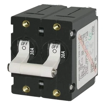 Amperage: 30A AC/30A DC, Color: White, Actuator Style: Toggle, 2 poles, Max Voltage: 120V AC/ 240V AC/ 65V DC, Interrupt Capacity: 3000A @ 120V AC/ 3000A @ 240V AC/ 1500A @ 240V AC [TUV]/ 3000A @ 240V AC [UL 1077]/ 7500A @ 65V DC, Mounting Screw Torque: 6 in-lb (0.68 Nm), Screw Terminal Torque: 14 in-lb (1.58 Nm) The industry standard circuit breaker for Blue Sea Systems' electrical panels Combines switching and circuit protection into a single device "Trip Free" design cannot be held "ON" during fault current condition Meets American Boat and Yacht Council (ABYC) standards