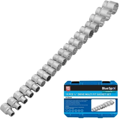 General description The Blue Spot Tools 19 Piece Multi Fit 1/2' Drive Socket Set is a versatile and essential tool kit designed for both professionals and DIY enthusiasts. This comprehensive set includes a wide range of socket sizes, making it suitable for various applications, from automotive repairs to home improvement projects. Technical specifications Socket sizes: 8mm to 32mm Drive size: 1/2 inch Number of pieces: 19 Compatibility and accessories Compatible with standard 1/2' drive ratchets and extensions Usage This socket set is ideal for loosening and tightening nuts and bolts in a variety of settings. Its multi-fit design allows for easy use on different fasteners, making it a practical addition to any toolbox.