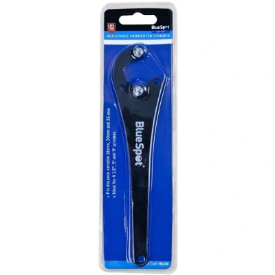 General description The BlueSpot Tools Adjustable Grinder Pin Spanner is specifically designed for use with locknuts on angle grinders. It allows for easy fitting and removal of abrasive discs, featuring a fully adjustable pin wrench and handle, making it versatile for different grinder sizes. This tool is ideal for 4.5-inch, 5-inch, and 9-inch grinders, providing a reliable solution for changing attachments quickly and securely. Technical specifications Pin distance: Adjustable to 26mm, 30mm, or 35mm Type: Grinder Pin Spanner MPN: 6160 EAN: 5028734061604 Installation Adjust the pin distance to match the locknut size Use the spanner handle to tighten or loosen locknuts securely Usage Set the pin distance according to the locknut size Place the pins into the locknut slots Turn the handle to tighten or loosen the locknut as needed Other information
