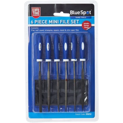 General description This 6-piece BlueSpot Tools Mini File Set includes a flat file, half-round file, triangular file, square file, round file, and slim taper file. It comes with a convenient storage pouch and features comfortable plastic handles for ease of use and control. Technical specifications Number of pieces: 6 Types of files: flat, half-round, triangular, square, round, taper Overall length: 150mm (6 inches) Blade length: 100mm (4 inches) Handle: plastic, ergonomic Compatibility and accessories Suitable for detailed filing and finishing work on metal, plastic, and wood Includes a storage pouch for organization and portability Installation No installation required; ready to use out of the box. Usage Use the files to smooth, shape, or remove material from various surfaces Hold the handle firmly and apply gentle, even pressure during use Other information Designed for DIY enthusiasts and professionals for detailed finishing tasks.
