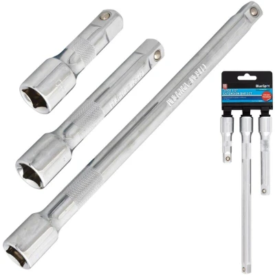 General description Set of 3 Blue Spot 1/2in Drive extension bars made from durable chrome vanadium steel, heat-treated for strength and resistance to wear, oxidation, and corrosion. This set is ideal for reaching fasteners in tight or hard-to-access spaces, making it a valuable addition to any toolbox or workshop. Technical specifications Material: Chromium-vanadium steel Finish: Chrome plated for durability Drive size: 1/2 inch Lengths: 3 inches (75mm), 5 inches (125mm), and 10 inches (255mm) Features: Spring-ball socket retainer, knurled handle for a secure grip Compatibility and accessories Compatible with all 1/2-inch drive sockets and ratchets Suitable for use with various hand tools and power tools that accept 1/2-inch drive accessories Installation Simply attach the extension bar to your socket or ratchet by aligning the drive ends and pushing until it clicks into place. Usage Use these extension bars to reach fasteners in confined or hard-to-access areas. Ensure the socket is