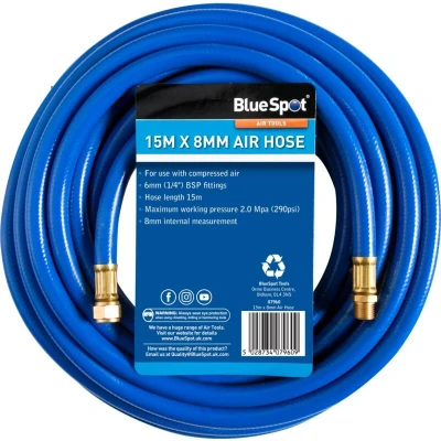 General description Blue Spot Tools 07960 is a durable 15m x 8mm air hose designed for various air-powered tools and applications. Its robust construction ensures longevity and reliability, making it an essential addition to any workshop or garage. Technical specifications Length: 15 meters Diameter: 8 mm Material: Flexible PVC Working pressure: 300 PSI Temperature range: -10°C to 60°C Compatibility and accessories Compatible with standard air compressors and pneumatic tools Includes quick-release connectors for easy attachment Installation Simply connect the hose to your air compressor and pneumatic tools using the quick-release connectors. Usage Ideal for inflating tires, powering air tools, and other pneumatic applications.