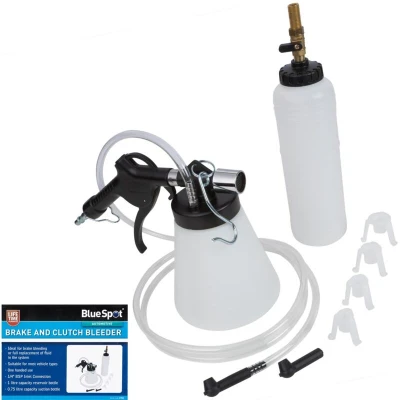 General description The Blue Spot Tools Brake and Clutch Bleeder utilizes air from your workshop compressor to efficiently bleed brake and clutch systems. This kit is designed for ease of use and is suitable for most vehicle types. Technical specifications Reservoir bottle capacity: 1 litre Suction bottle capacity: 0.75 litre Inlet connection: 1/4" BSP Compatibility and accessories Includes a range of adaptors to connect the brake fluid refill bottle to your brake fluid reservoir Usage Ideal for brake bleeding Suitable for full replacement of fluid in the system Designed for one-handed use