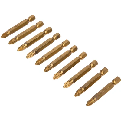 General description The BlueSpot Tools Titanium Coated Pozi Screwdriver Bits are crafted from high-quality S2 steel and feature a titanium nitride coating for enhanced durability. This set is designed for use with high-resistance materials, including hardwood, metal, plastic, and drywall. Technical specifications Length: 50mm Pack Quantity: 10 bits Head Type: Pozidriv (PZ2) Manufacturer Part Number: B/S14105 Size: PZ2 Compatibility and accessories Compatible with all power drills, cordless drills, and screwdrivers that have a 1/4-inch hex bit holder Installation Insert the PZ2 bit into the drill or screwdriver's hex bit holder Usage Use the bits for driving screws into various resistant materials such as hardwood, metal, plastic, and drywall Other information