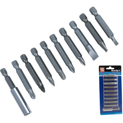 General description The BlueSpot 10 Piece Power Bit Set is made from durable chrome vanadium steel and features a magnetic bit holder for secure and easy handling. It includes a variety of bits suitable for different tasks, making it a versatile addition to any toolkit. Technical specifications Material: Chrome vanadium steel Includes: 3 Phillips bits (PH1, PH2, PH3), 3 Pozidriv bits (PZ1, PZ2, PZ3), 3 Slotted bits (4mm, 6mm, 8mm) Bit length: 50mm Compatibility and accessories Compatible with standard power drills and screwdrivers Includes magnetic bit holder for secure bit attachment Installation Insert the desired bit into the magnetic holder or directly into your drill or screwdriver Ensure the bit is securely attached before use Usage Use for driving screws into various materials such as wood, metal, and plastic Suitable for DIY projects, home improvement, and professional tasks Other information Set includes a variety of bits for different screw types and sizes Manufactured for