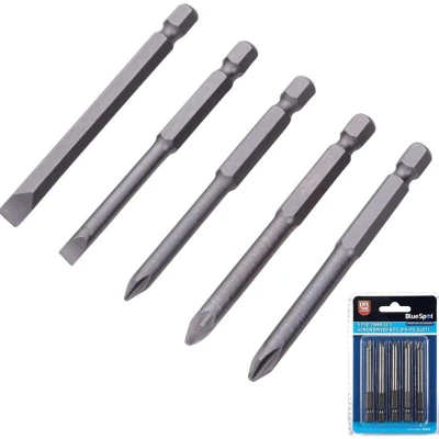 General description The Blue Spot Tools 5 Piece 75mm (3') Screwdriver Bits set includes a variety of bits designed for use with power drills and screwdrivers. These bits are made from high-quality materials, ensuring durability and longevity for various DIY and home improvement tasks. Technical specifications Bit length: 75mm (3') Types included: PH (Phillips), PZ (Pozidriv), and Slot Compatibility and accessories These screwdriver bits are compatible with most standard power drills and screwdrivers. They can be used for a wide range of applications, including woodworking, metalworking, and general repairs. Usage To use the screwdriver bits, simply insert them into a compatible power drill or screwdriver. Ensure the bit is securely fastened before use to prevent slipping or damage to the screw head.