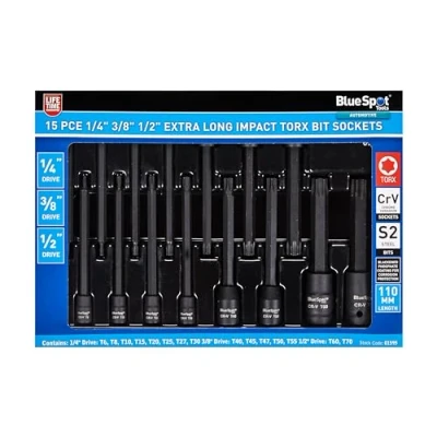 Blue Spot Tools 15 PCE 1/4", 3/8" & 1/2" Extra Long Impact Torx Bits Sockets (T6 T70)
