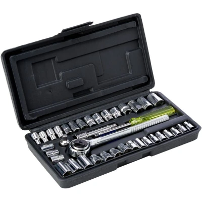 General description This BlueSpot 40-Piece Metric and Imperial Drive Socket Set includes a variety of sockets and accessories designed for both professional and DIY use. The set features a combination of 1/4" and 3/8" drive sockets, a reversible ratchet handle, and extensions, making it versatile for various tasks. Technical specifications Model: 01535 Socket sizes: 12 x 1/4" Hex sockets (5/32, 3/16, 7/32, 1/4, 9/32, 5/16, 11/32, 3/8, 13/32, 7/16, 15/32, 1/2 AF) 13 x 1/4" Hex sockets (4, 4.5, 5, 5.5, 6, 6.5, 7, 8, 9, 10, 11, 12, 13mm) 3 x 1/4" 8 Pt sockets (1/4, 5/16, 3/8) 1 x 1/4" Spinner handle 1 x 1/4" to 3/8" Adaptor 3 x 3/8" Hex sockets (7/16, 9/16, 1/2 AF) 3 x 3/8" Hex sockets (11, 12, 13mm) 1 x 3/8" Reversible ratchet handle 1 x 3/8" Extension bar 1 x 3/8" Spin disc 1 x moulded case Compatibility and accessories Compatible with all threaded bolt products Can be used with various sizes of bolts and screws requiring hand tightening Installation Simply screw onto the matching