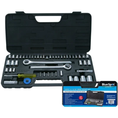 General description Blue Spot Tools presents a comprehensive Mixed Drive Socket Set, featuring 52 pieces designed for both metric and imperial applications. This versatile set includes a variety of hex sockets, ratchet handles, and screwdriver bits, making it an essential addition to any DIY enthusiast or professional's toolkit. Technical specifications Number of Sockets: 39 Set Type: Metric & Imperial Socket Sizes: 12 x 1/4 Hex sockets (5/32, 3/16, 7/32, 1/4, 9/32, 5/16, 11/32, 3/8, 13/32, 7/16, 15/32, 1/2 AF) 13 x 1/4 Hex sockets (4, 4.5, 5, 5.5, 6, 6.5, 7, 8, 9, 10, 11, 12, 13mm) 3 x 1/4 8 Pt sockets (1/4, 5/16, 3/8) 3 x 3/8 Hex sockets (7/16, 9/16, 1/2 AF) 3 x 3/8 Hex sockets (11, 12, 13mm) 4 x 1/2 Hex sockets (5/8, 11/16, 3/4, 13/16 AF) Compatibility and accessories 1 x 1/4 Spinner handle 1 x 1/4 to 3/8 Adaptor 1 x 1/4 Hex bit holder 3 x 1/4 Hex Phillips screwdriver bits (PH1, PH2, PH3) 2 x 1/4 Hex Slotted screwdrivers (3/16 and 9/32 in) 1 x 3/8 Reversible ratchet handle 1 x 3/8