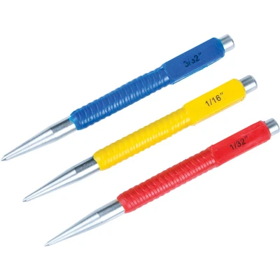 General description This is a 3-piece nail punch set designed for driving nails and brads for a smooth finish. Manufactured from heat-treated alloy steel, each punch features a knurled body for a secure grip. The set includes sizes 1/32 inch, 1/16 inch, and 3/32 inch, suitable for various finishing tasks. Technical specifications Material: Heat-treated alloy steel Number of pieces: 3 Sizes: 1/32 inch, 1/16 inch, 3/32 inch Tip type: Mixed set Compatibility and accessories Designed for use with nails and brads in finishing carpentry. Installation No installation required; simply select the appropriate punch size for your task. Usage Use the punch to set nails flush with the surface for a neat finish. Apply force to drive nails or brads into wood or other materials.