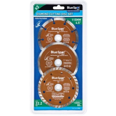 General description Blue Spot Tools presents a high-quality 3-piece diamond cutting disc set, designed for precision cutting in various materials. Each disc measures 115mm (4.5 inches) in diameter, making them suitable for a range of cutting applications. Technical specifications Disc diameter: 115mm (4.5 inches) Material: Diamond Quantity: 3 discs Usage This diamond cutting disc set is ideal for cutting through materials such as tile, stone, and concrete. The discs provide a clean and efficient cut, making them perfect for both professional and DIY projects.