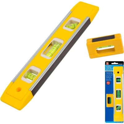 General description This magnetic torpedo level is designed for precise measurements in small building projects. It features a durable plastic body reinforced with an aluminum frame for increased strength and longevity. The level includes a mini version with a magnetic base for versatile use and hands-free operation. Technical specifications Length: 225mm (9 inches) Material: Plastic body with aluminum frame Vials: Three spirit level vials set at horizontal, vertical, and 45° angles Additional: Mini level with magnetic base and horizontal vial Compatibility and accessories Compatible with standard small building and DIY projects Includes mini magnetic level for detailed measurements Installation No installation required; simply place the level on the surface to measure Usage Place the level on the surface to check horizontal, vertical, or 45° angles Use the magnetic base to attach the level to metal surfaces for hands-free operation Other information Product registration on the