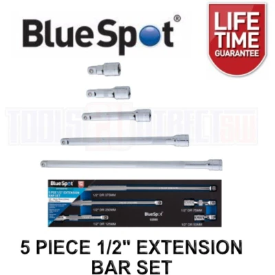 General description The Blue Spot Tools 5 Piece 1/2' Extension Bar Set is designed for enhanced accessibility and versatility in various applications. This set includes five extension bars that allow you to reach tight spaces and improve your torque capabilities when working with sockets. Technical specifications Size: 1/2 inch Number of pieces: 5 Length of extension bars: 75mm, 150mm, 225mm, 300mm, and 450mm Other information For visual reference, please check the product images and videos provided by the sellers.