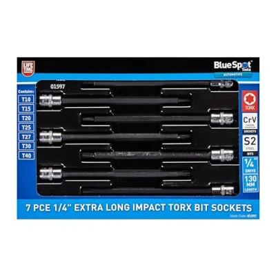 ManoManoGeneral description The Blue Spot Tools 7 Piece 1/4' Extra Long Impact TORX Bit Sockets set is designed for heavy-duty use, providing durability and performance for various applications. These sockets are ideal for reaching difficult areas and are compatible with impact drivers. Technical specifications Socket Size: 1/4' Number of Pieces: 7 Material: Chrome vanadium steel Finish: Black phosphate Length: Extra long design for extended reach Compatibility and accessories Compatible with standard 1/4' drive tools Includes various TORX sizes for versatility Usage Ideal for automotive and mechanical applications Perfect for use in tight spaces where standard sockets cannot reach