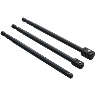 General description These BlueSpot Impact Socket Adaptors are designed for enhanced strength and durability, manufactured from chrome vanadium steel. This 3-piece set includes adaptors for 1/4in, 3/8in, and 1/2in drive sizes, making them suitable for use with cordless screwdrivers and drills. A ball bearing mechanism helps secure the socket during use. Technical specifications Material: Chrome vanadium steel Drive sizes: 1/4", 3/8", and 1/2" Length: approximately 150mm (6 inches) Compatibility and accessories Compatible with impact wrenches, cordless screwdrivers, and drills Includes adaptors for 1/4", 3/8", and 1/2" drive sizes Installation Insert the adaptor into the power tool's chuck or socket Attach the desired socket to the adaptor Usage Use with impact tools for driving or loosening fasteners Ensure the ball bearing clicks into place for a secure fit before operation Other information Manufactured from chrome vanadium steel for durability Suitable for professional and DIY use
