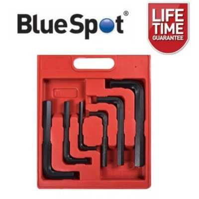 General description The BlueSpot Jumbo Hex Key Set includes 6 metric keys ranging from 8mm to 19mm. These keys are made from heat-treated steel and feature a blackened oxide coating for corrosion resistance. The precise and chamfered ends ensure a smooth fit into fastener heads, minimizing wear. The long arm design provides increased reach and torque, making them ideal for automotive applications. The set comes in a convenient carrier that securely holds each key in a marked slot for quick identification. Technical specifications Material: Heat-treated steel Coating: Blackened oxide Sizes included: 8mm, 10mm, 12mm, 14mm, 17mm, 19mm Other information Outer plastic case with handle for easy storage and transportation