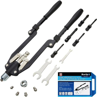 BlueSpot Long Arm Rivet (3.2-6.4) and Nut Riveter (M4-M10) Set Suitable for use with steel, stainless steel and aluminium rivet nuts Heavy-duty extra long handles Unfolded length: 510mm (20") To activate the manufacturers lifetime guarantee, you will need to register the product on the Bluespot website within 30 days of purchase.