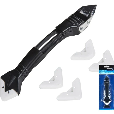 BlueSpot Silicone Sealant Multi Tool. Multi-function design that includes a trowel, remover, corner cleaning tip and a surface cleaning blade. Ideal for removing old silicone and adding new finishes. Complete with 5 quick change profiles in different sizes. Scraper length ? 185mm.