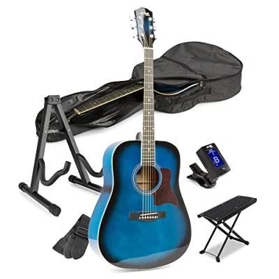 Blue Starter Acoustic Guitar Kit Beginner Guitars Set with Digital Tuner, Footrest, Adjustable Stand, Gig Bag & 6 Month Online Lessons, Ideal for Adults Kids