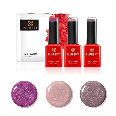 3 GEL NAIL POLISHES: Expand your gel nail kit with this mini trio set, includes Rose Valley Romance, Magenta Glitter Sparkle, Indian Summer, Nude Pink Glitter Sparkle, Island Hopping, Mauve Glitter Sparkle 21 DAY HIGH-GLOSS WEAR: Long-lasting and chip-resistant gel polish that leaves your nails with a high-gloss finish for up to 21 days. For best results use with our gel base and top coat. DRIES IN 60 SECONDS: No need to worry about smudging our Bluesky gel nail polishes cure in 60 seconds under our LED and UV nail lamp. EASY TO REMOVE: Soak off gel nail polish in minutes with acetone or use our specialised remover products for safe and easy gel polish removal without damaging your natural nails. VEGAN-FRIENDLY and CRUELTY-FREE: Bluesky products are and always will be cruelty-free - we never test on animals. We are also registered by The Vegan Society as Vegan Friendly