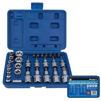 General description The Blue Spot Tools 29 Piece Torx Socket & Bit Set is a comprehensive collection designed for both professional and DIY enthusiasts. This set includes a variety of Torx sockets and bits, making it ideal for a wide range of applications, from automotive repairs to home improvement projects. Technical specifications 29 pieces in total Includes various Torx sizes Material: Chrome vanadium steel Finish: Chrome plated for corrosion resistance Compatibility and accessories Compatible with standard Torx fasteners Includes a sturdy storage case for easy organization Installation To use the Torx sockets and bits, simply select the appropriate size for your fastener and attach it to your ratchet or screwdriver. Ensure a secure fit to avoid stripping the fastener. Usage This set is perfect for: Automotive repairs Home improvement tasks General maintenance and assembly