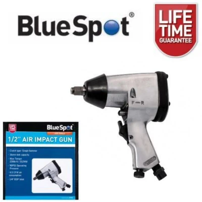 General description The Blue Spot Tools 1/2" Air Impact Wrench is designed for everyday use, making it suitable for both professional and DIY applications. Its robust construction ensures durability in demanding work environments, while the forward and reverse gear allows for easy operation with one hand. Technical specifications Clutch type: Single hammer 16mm bolt capacity Max Torque: 230 lb-ft (312 NM) Operating Pressure: 90 PSI Air consumption: 4.5 cfm (113 l/min) Inlet: 1/4" BSP