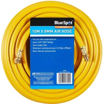 General description The Blue Spot Tools 10m x 8mm Air Hose is designed for professional use, made from flexible reinforced rubber that is both oil and abrasion resistant. This construction minimizes the likelihood of kinking during operation. Technical specifications Hose length: 10m (32ft) Internal diameter: 8mm Maximum working pressure: 2.0 Mpa (290 psi) Fittings: One male and one female 1/4" BSP