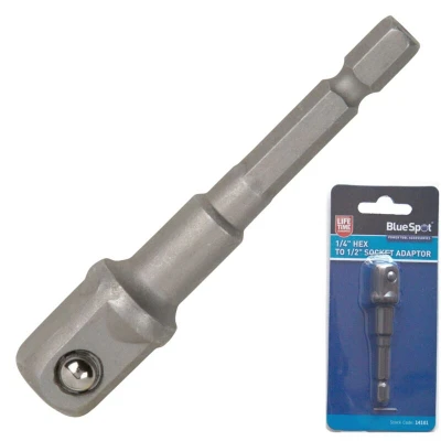 General description The Blue Spot Tools 1/4' Hex to 1/2' Socket Adapter is a versatile tool designed to convert a 1/4' hex shank into a 1/2' socket drive. This adapter allows for the use of 1/2' sockets with power tools that have a 1/4' hex chuck, making it ideal for various DIY and home improvement tasks. Technical specifications Size: 1/4' hex to 1/2' socket Material: Durable steel construction Length: 50 mm Compatibility and accessories Compatible with standard 1/2' sockets Works with power drills and impact drivers featuring a 1/4' hex chuck Usage This adapter is perfect for: Converting 1/4' hex tools to use 1/2' sockets Facilitating quick changes between different socket sizes Enhancing the versatility of your power tools