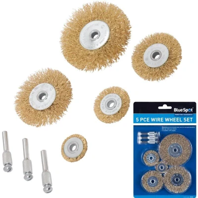 General description Blue Spot Tools 5 Piece Wire Wheel Set is a handy set of five wire brush wheels designed for use with a power drill. Technical specifications Includes wire brush wheels of the following sizes: 25mm (1"), 32mm (1-1/2"), 50mm (2"), 62.5mm (2-1/2"), and 75mm (3"). Provided with two 1/4" shank arbors for attaching wheels to your drill.