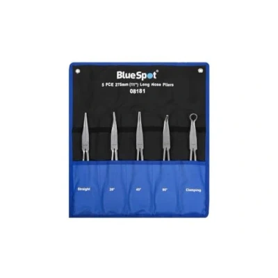 General description The Blue Spot Tools 5-piece Long Nose Pliers set includes straight, 20°, 45°, 90°, and clamping pliers, all designed for enhanced durability and comfort. Manufactured from chrome vanadium steel, these pliers are built to last and come with soft-grip handles for increased comfort during use. Technical specifications Material: Chrome vanadium steel Pliers length: 275mm (11") Hole diameter: 13mm Other information Supplied in a wallet Lifetime warranty