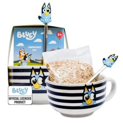 Morning Magic: Turn breakfast time into a Bluey adventure with this charming ceramic bowl and spoon set. The cheerful design featuring beloved characters makes every meal feel special. Perfect Bluey Christmas & Birthday gifts for 3 year old girls & boys Quick Prep: Just mix 50g of included porridge oats with milk of your choice, microwave for 2 minutes, and you're sorted. Two generous servings mean fewer shopping trips and more time for family fun at the breakfast table! Versatile Dining: These microwave and dishwasher-safe cereal, soup, and dessert bowls work brilliantly for overnight oats too. The generous size handles everything from hearty porridge pots to light snacks Family Friendly: Designed for ages 3 and up, the sturdy ceramic construction and comfortable spoon make independent eating easier. Watch little ones beam with pride using their very own Bluey breakfast set! Easy Cleanup: Pop the striped bowl straight into the dishwasher after use, whilst the spoon needs just a quick hand wash. More time playing, less time scrubbing - exactly how breakfast should be!