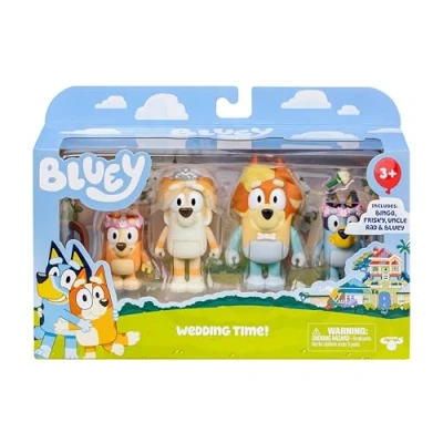 Bring the fun and imaginative play of Bluey and her family home with this adorable Bluey Figure 4 Packs - "Wedding Time" The "Wedding Time" 4 Pack includes Bluey & Bingo dressed as flower girls, Uncle Rad and Frisky The "Wedding Time" 4 Pack includes a flower bouquet accessory! These exclusive figures are only available in this special Bluey 4 Pack Bring Bluey's world to life with a range of figures, playsets and accessories, Manufacturer: Moose Toys