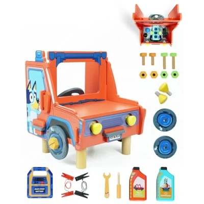 Bluey Wooden Tabletop Mechanic Set 22 Piece Pretend Play Repair Tool Kit with Car Engine, Tools & Accessories Compact Portable Toy for Kids Ages 3+
