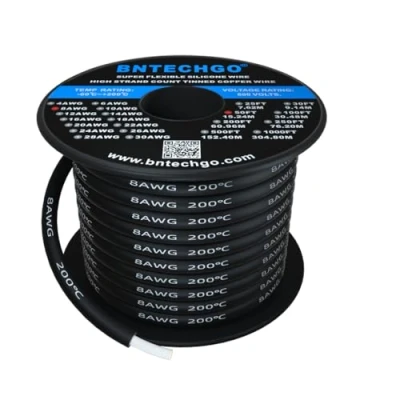 High Quality Ultra Flexible Soft Silicone Rubber Copper Wire!Super Low Impedance,Highly Efficient! High strand count copper core,8 AWG silicone stranded wire has 1650 strands 0.08 mm tinned copper wire,the copper strands are tinned,protecting them from corrosion and making it easier to solder. They are constructed with premium silicone rubber insulation.High temperature resistance 200 degree C,Low temperature resistance,in extreme cold -60 degree C.Rated Voltage: 600 volts.Outside diameter 6.5 mm,tolerance +/- 0.1 mm. 8 gauge silicone wire spool: Black total 50 ft. BNTECHGO silicone wire are widely used for model planes,model cars,model ships,lamps,household appliances,electric heating appliances,meters,instruments,motor and digital fields., Manufacturer: bntechgo.com