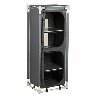 Very sturdy and stable storage high cupboard. 4 Storage compartments with shelves and side pockets. Compact and portable in the included carry bag. Including 4 adjustable legs and a sturdy top. Includes carrying case.