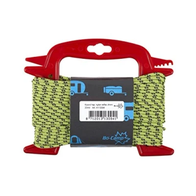 Guy line roll ideal for securing tents, folding trailers, awnings, windscreens etc.. Reduced stumble and fall through the reflective fluorine yellow reflective wires. Made of strong durable nylon. Lightweight.