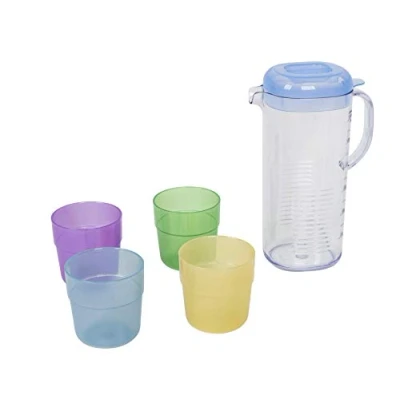 A handy plastic can with 4 glasses. Ideal for camping or for a picnic. The glasses can be stored in the jug, making it very compact to take with you. Content: 13 ml Content: 13 ml