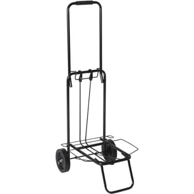 Collapsible steel luggage trolley. Comes with large wheels, a handle and extra collapsible support. Ideal to move a Jerrycan, waste water tank, or luggage. Load bearing capacity to 35 kilogram. Including plastic spin.